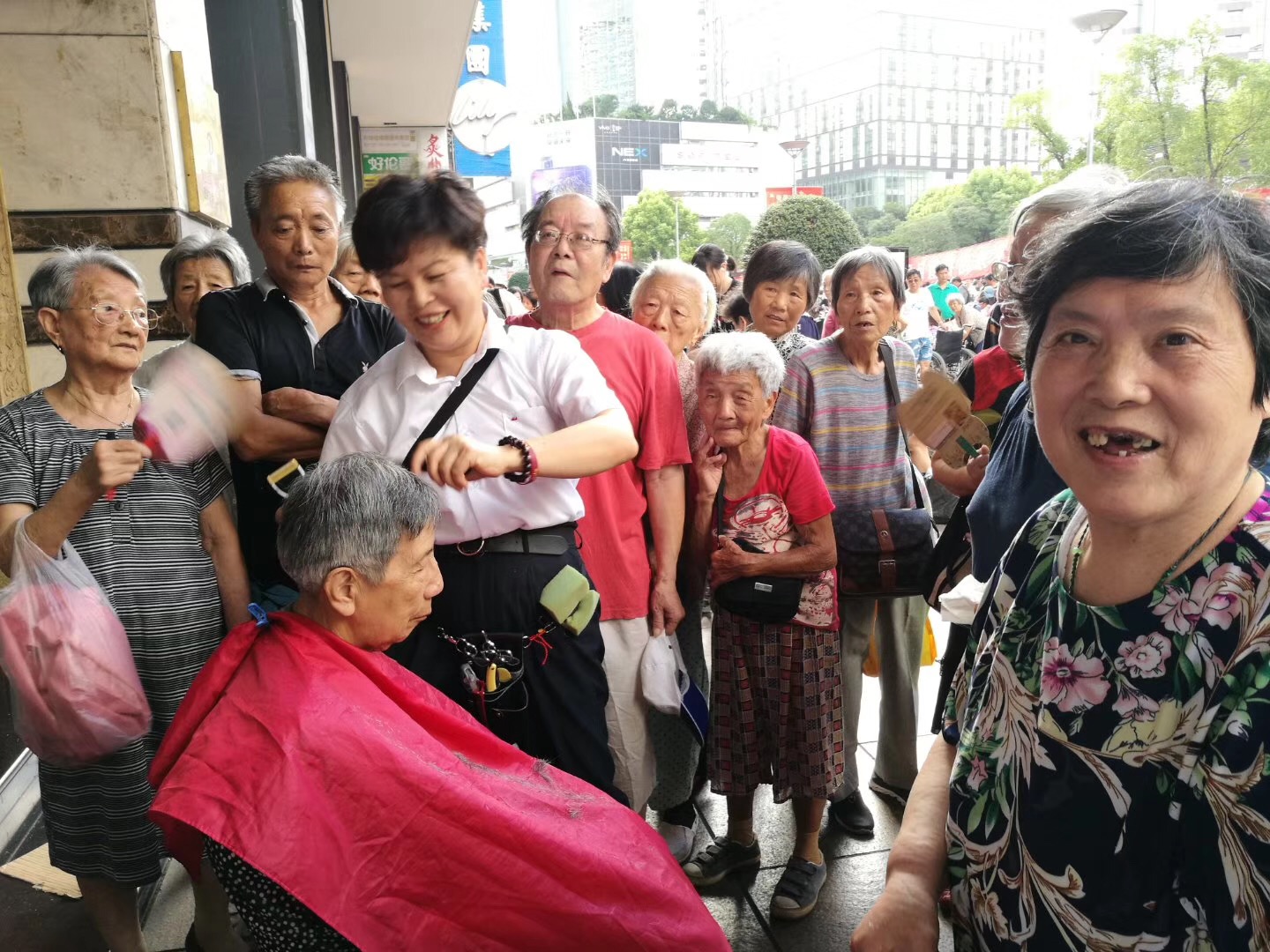 党员施华晚上收工后,没休息几个钟头就来到南京路参加服务。理发师张群英今天本因当班,但是她放弃了几个小时的营运时间,坚持做好为民服务的工作。江苏籍的哥彭广兵,一边抹着汗一边为老人们塑封照片。老党员陈建国、金康生、陈琴也都井然有序地干着自己手里的活。因身体原因已离开出租行业的原班组成员马乾东,也从未真正离开过班组,每次他也都是准时参加活动。有一次有人问张群英,你觉得这样累吗?值吗?张群英笑着说:“你看这个老人拿了把摇扇,自己不扇却给我不停地扇着,所以我觉得不累,很值。”