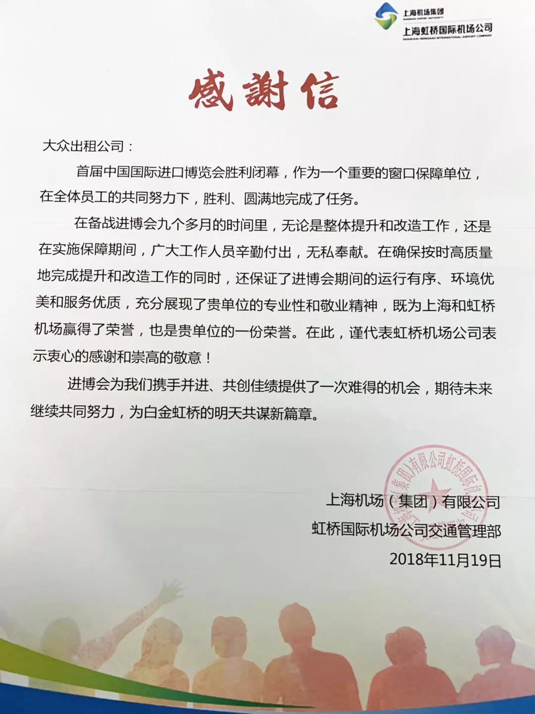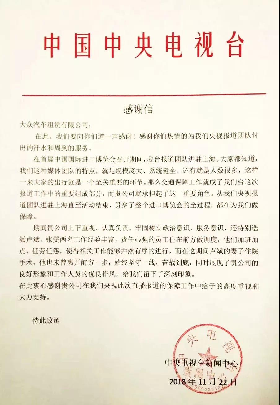 大众出租租赁继收到上海市政府新闻办表彰信后,近日又收到中央电视台新闻中心、上海机场集团有限公司发来的感谢信,对大众在进博会期间提供的优质出行服务表达诚挚的谢意。