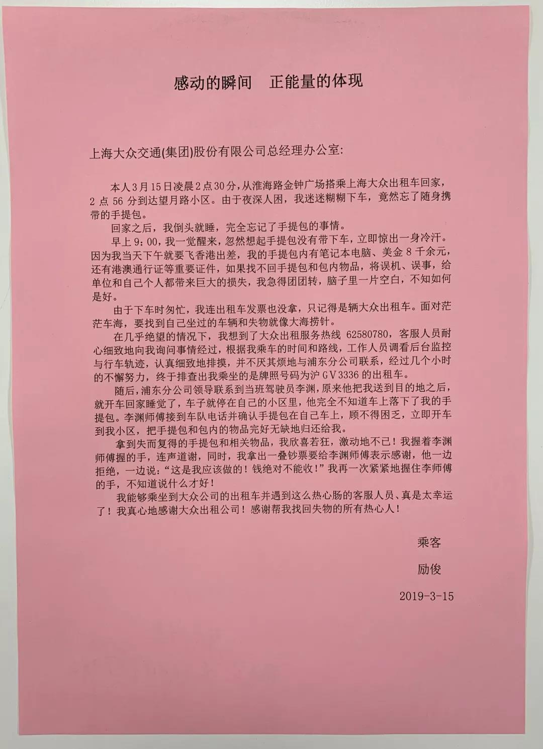 新民晚报讯(首席记者 曹刚 通讯员 赵巧珍)近日,市民励先生专程来到大众出租租赁公司,送上锦旗和感谢信,感谢热心的大众职工10天前帮他找回手提包,内有8000多美元和港澳通行证等重要证件。