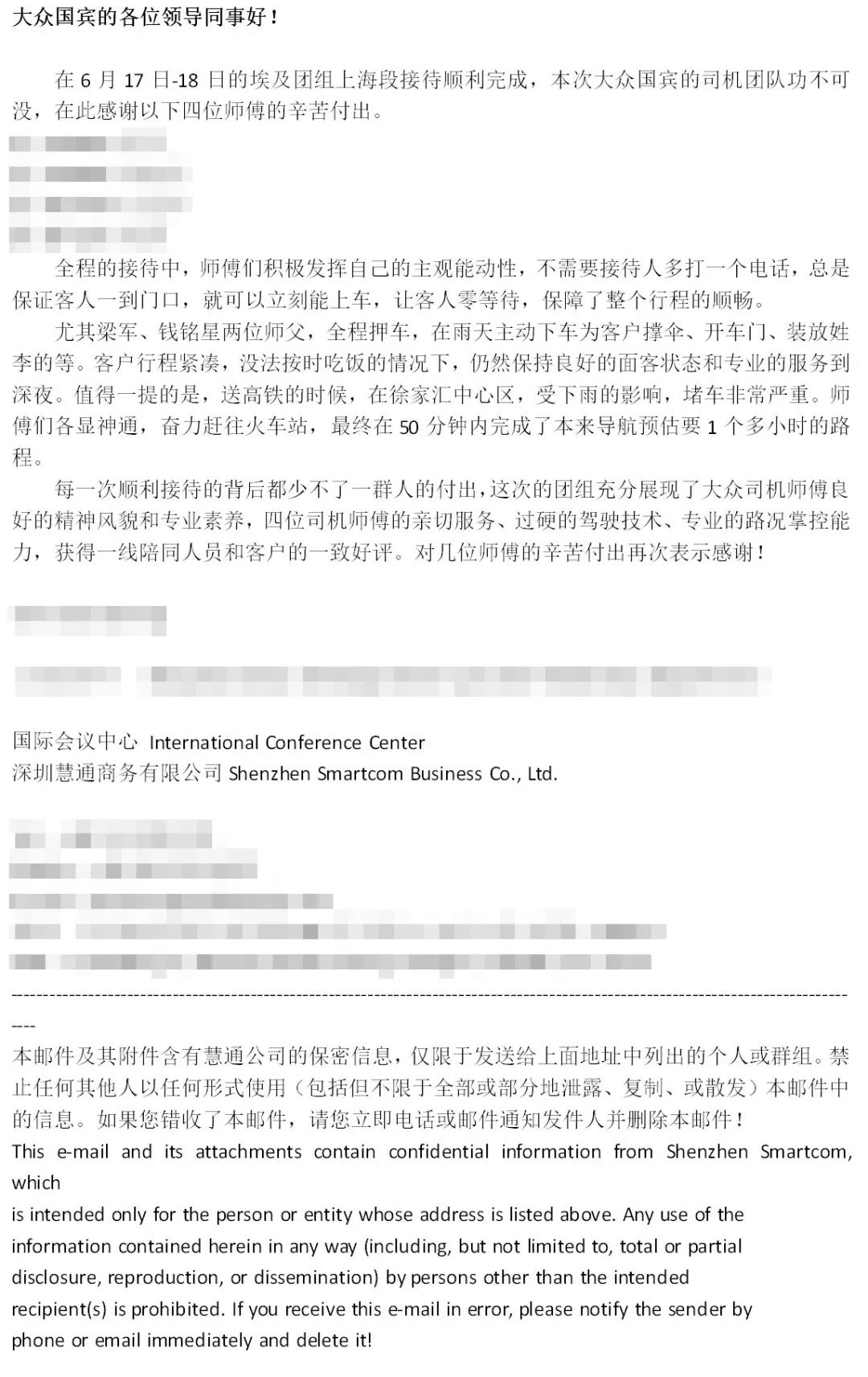 大众出租租赁管理团队、驾驶团队挑战南北两地全程服务,尽职尽责圆满完成所有会务任务,受到多方好评与称赞。