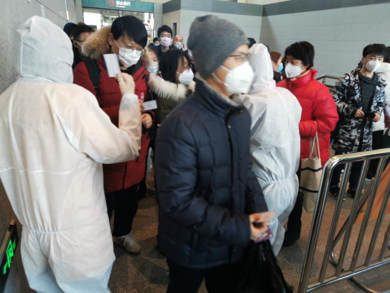 组织为乘客测温与实名登记的“志愿者服务队”。