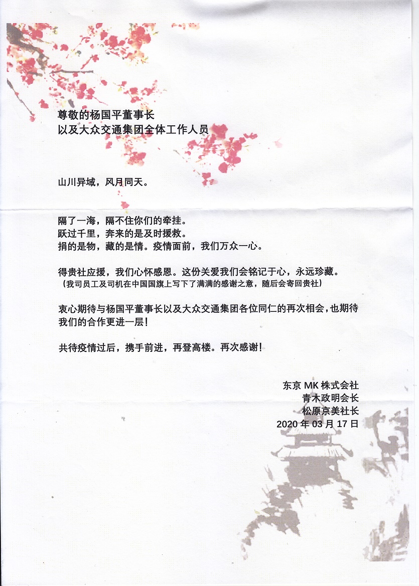 近日,日本东京MK株式会社寄来分别用中日文写成的回信,向大众的援助表示感谢,信中写道: