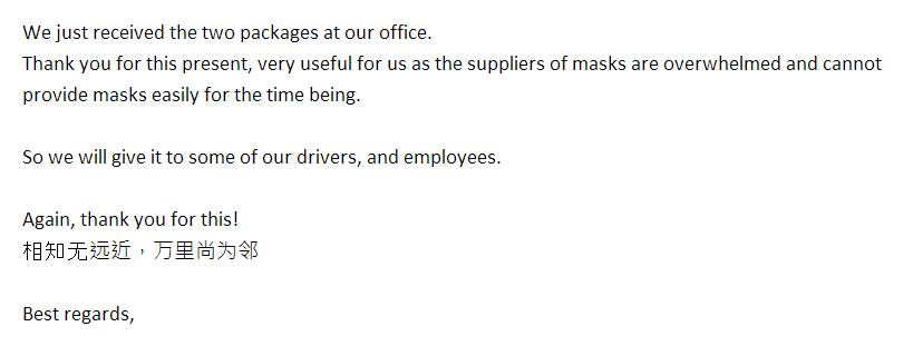 日前,ROUSSELET集团已收到来自大众的口罩,并通过邮件表示感谢,在邮件中特别用中文引用了两句唐诗:相知无远近,万里尚为邻。