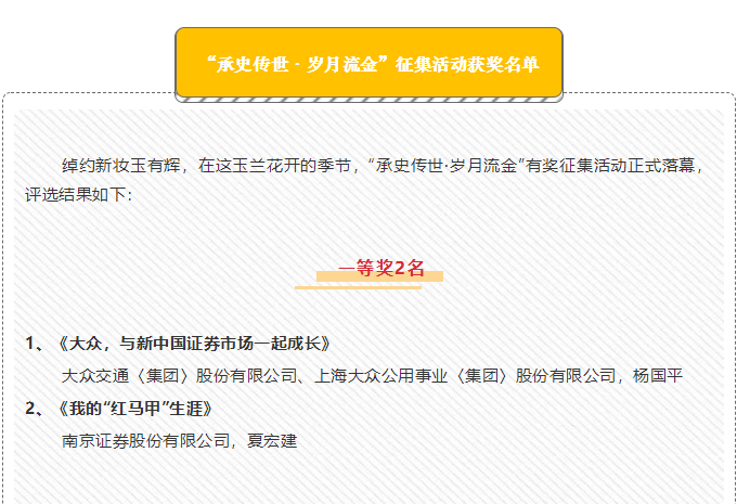 由上海证券博物馆主办的“承史传世·岁月流金”有奖征集活动结果日前揭晓,大众交通(集团)股份有限公司董事长兼总裁、上海大众公用事业(集团)股份有限公司董事局主席杨国平口述的《大众,与新中国证券市场一起成长》荣获一等奖,文章记录了“大众”品牌于1988年创立以及公司于1992年在上海交易所上市的经过,具有珍贵的历史意义。另外,大众交通集团董事会秘书贾惟姈提供的《1992年,上海大众出租汽车股份有限公司召开创立大会暨第一届股东大会》等历史照片荣获优秀奖。