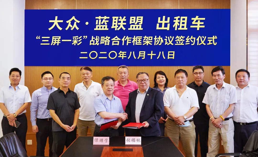 大众科技总经理、广告公司董事长谭游学与出租车蓝联盟秘书长、衡山出租总经理张福林在仪式上分别签约。