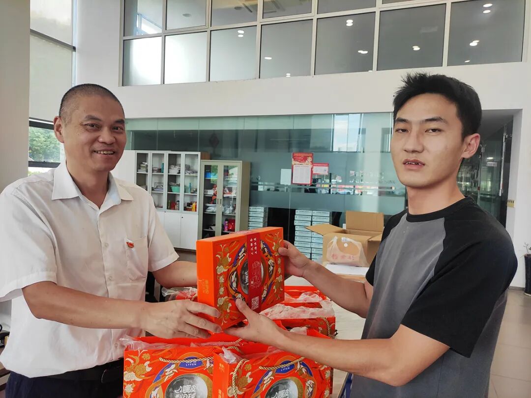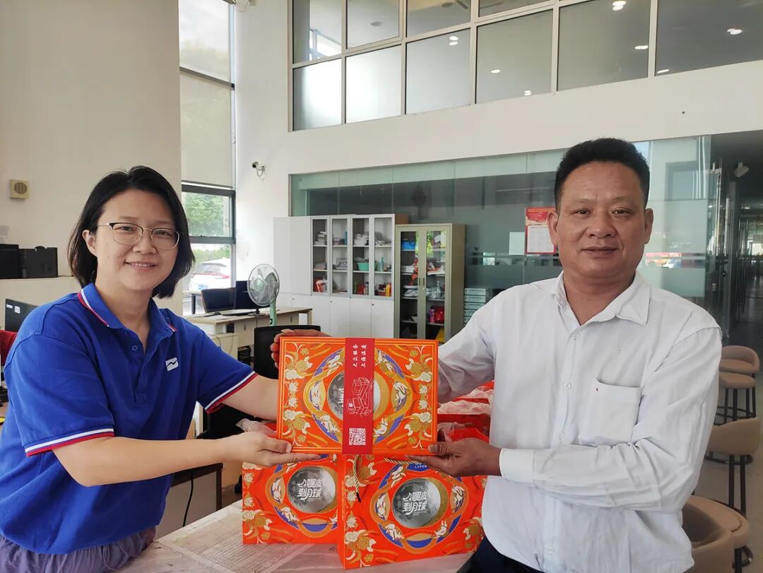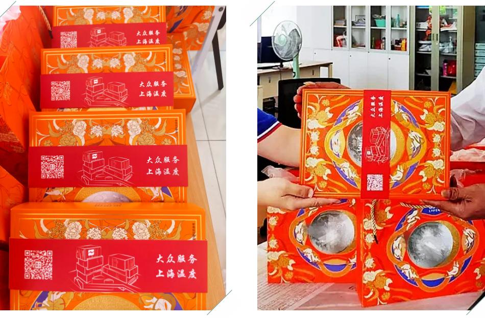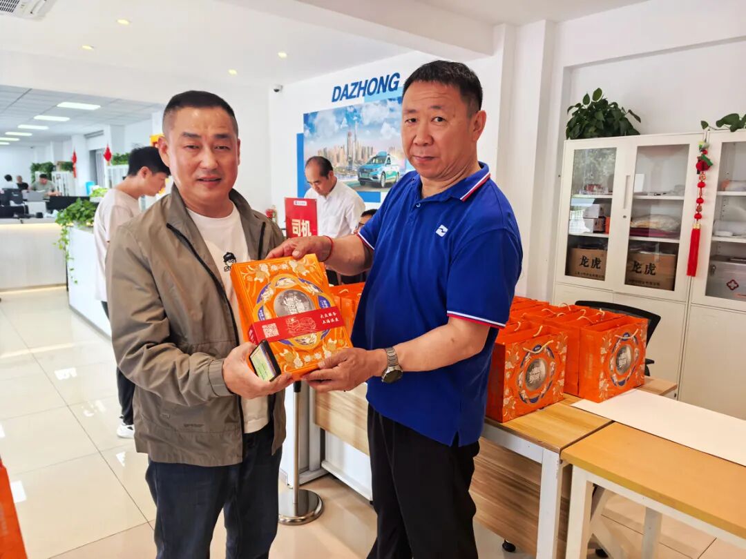 车队长们捧着月饼礼盒走到师傅们中间:“这位师傅,这是公司联合工会准备的,带回家和家人尝尝” 又对年轻司机说:“第一次在上海过双节吧?这是知名品牌月饼,盒上有‘大众服务,上海温度’,吃着甜,心里更暖!”
