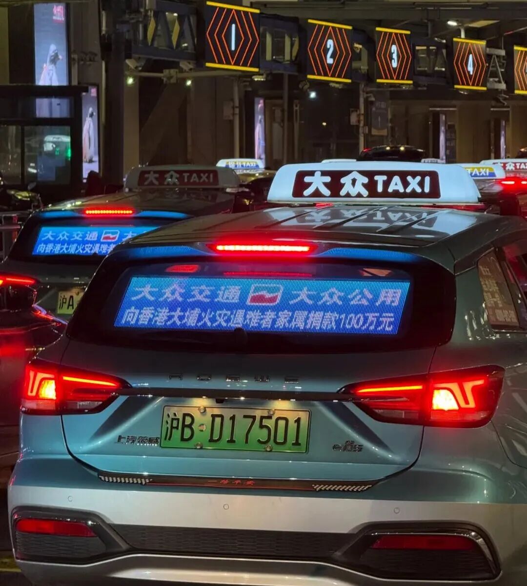 同日,行驶在上海街头的所有大众出租车后窗屏,同步亮起“同胞有难 大众相助 心系大埔 沪港同舟”的醒目标语。这一暖心举动不仅传递了大众集团对香港同胞的深切关怀,更呼吁社会各界凝聚爱心力量,与香港同胞携手共渡难关。